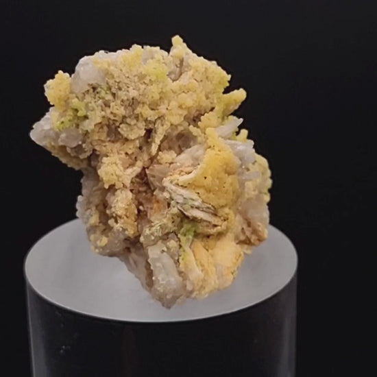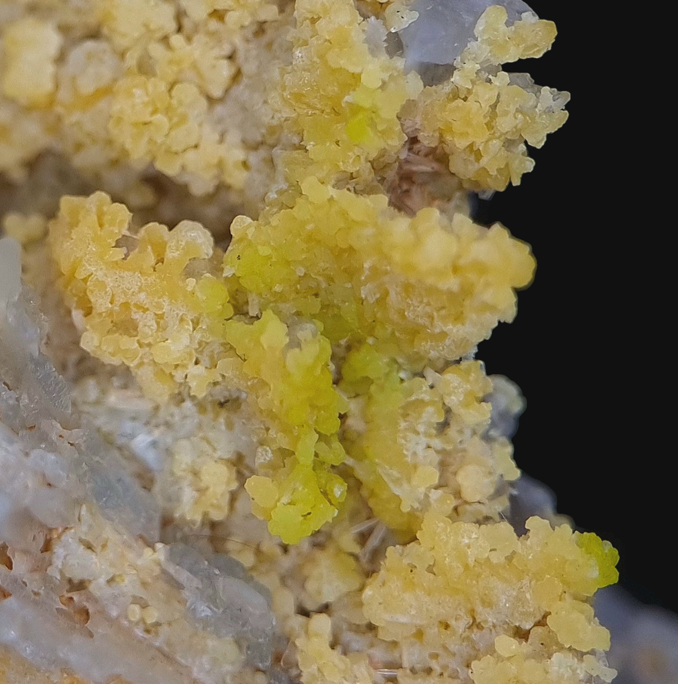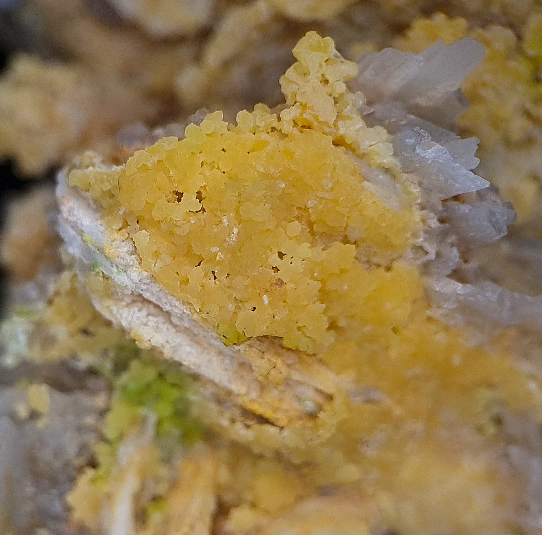 🇺🇲Beautiful yellow and translucent, bubbly/botryoidal and droplet-like mimetite with patches of yellow-green pyromorphite partly covering light-gray chert from Badenweiler in the Black Forest.