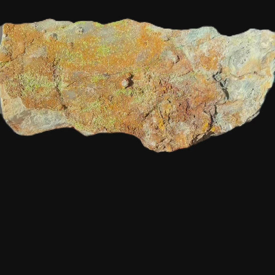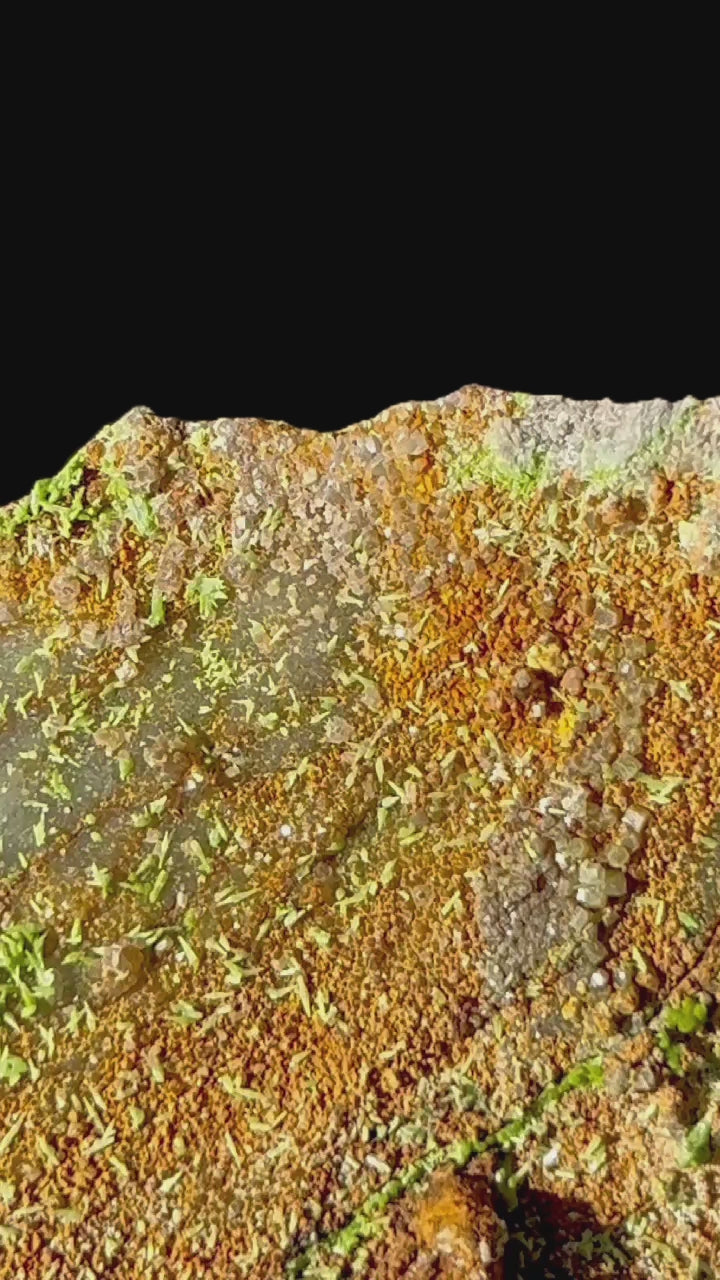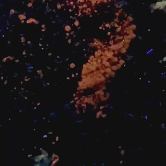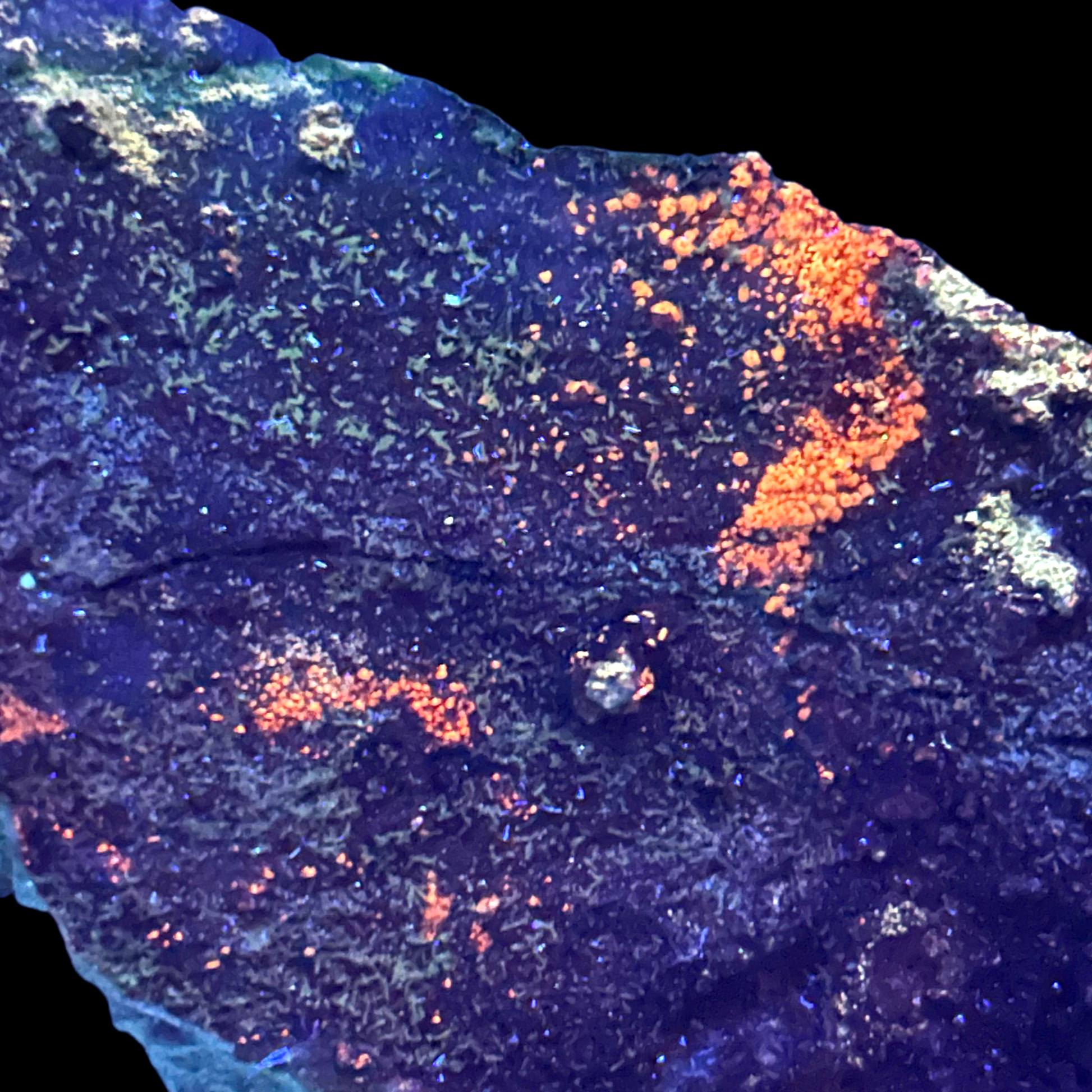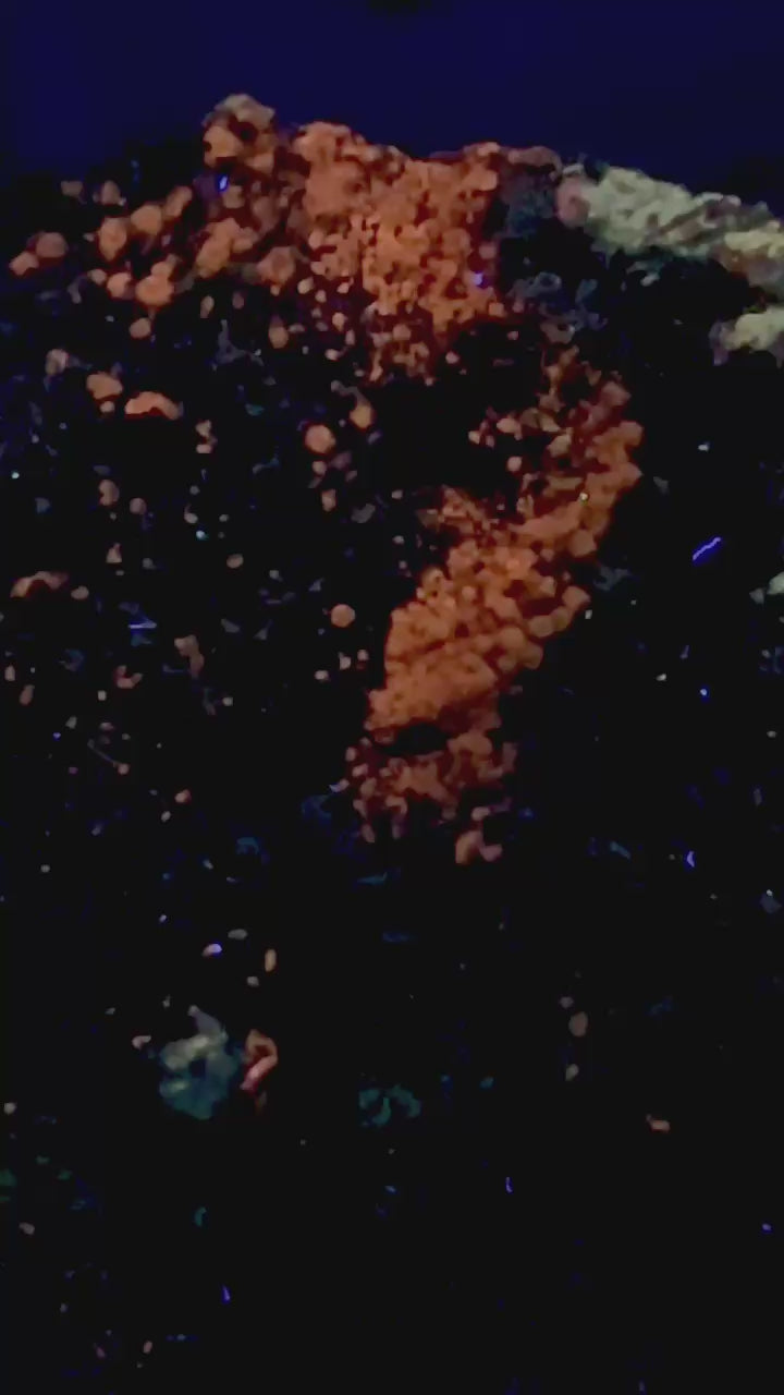 Die zweite Generation weist fassförmige, beige Kristalle auf, die unter UV-Licht orange fluoreszieren.