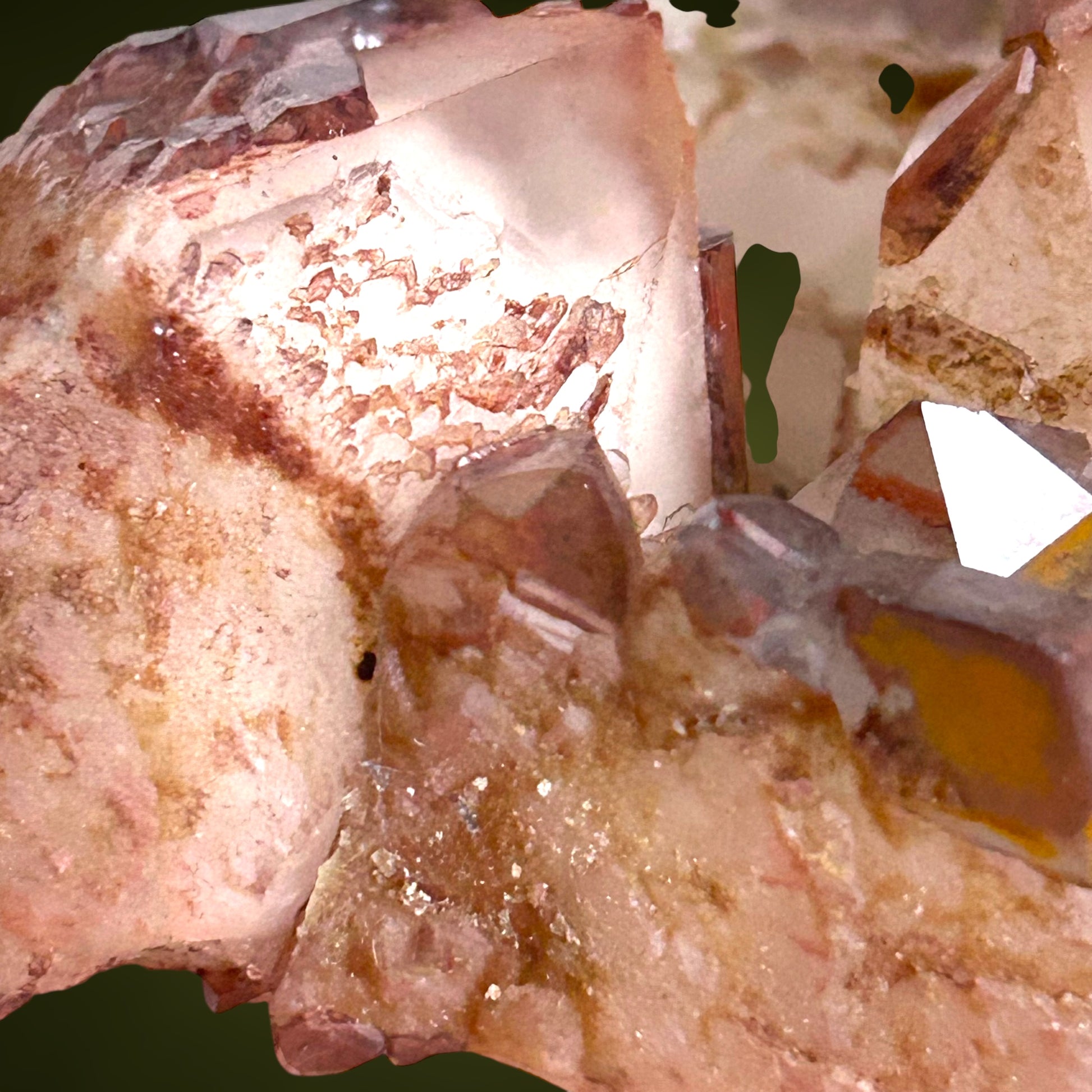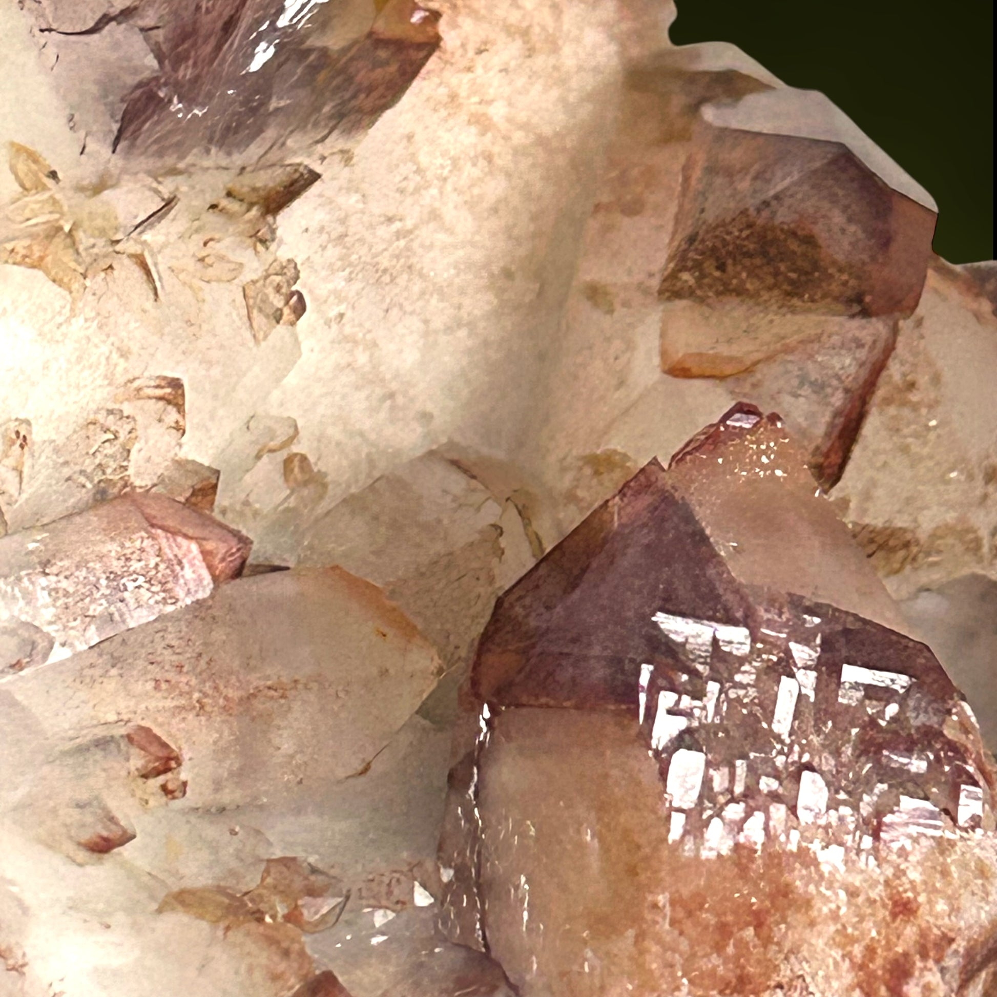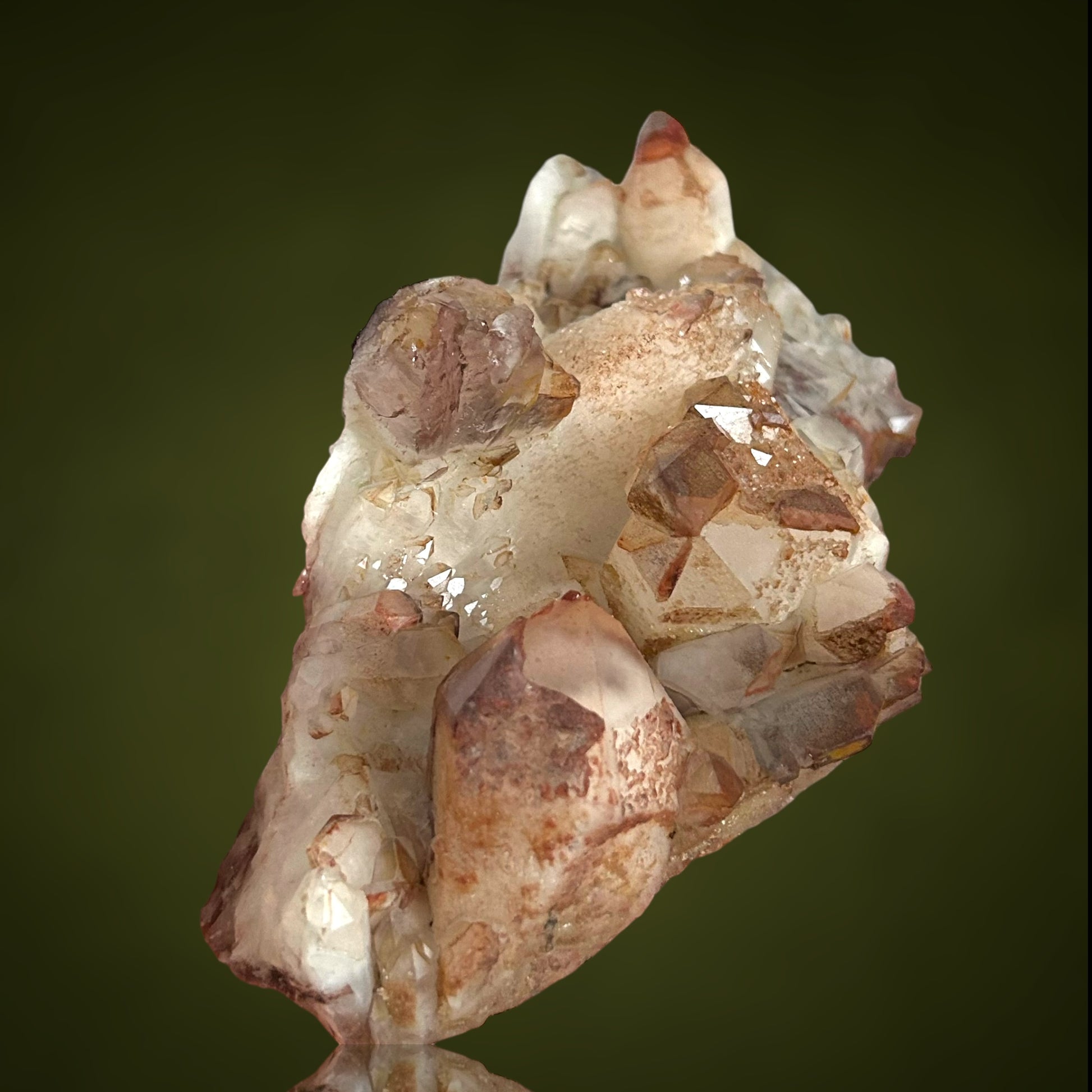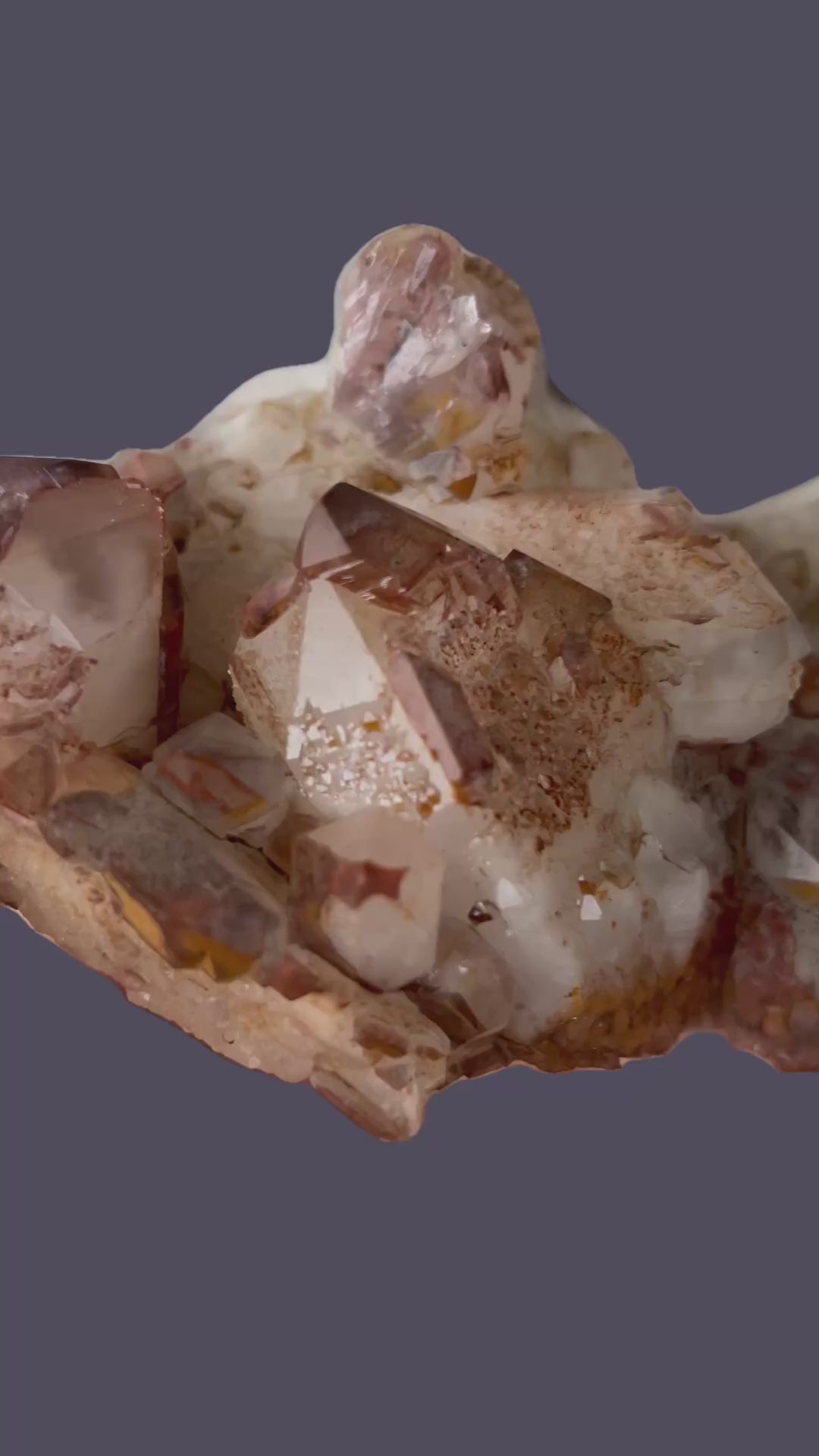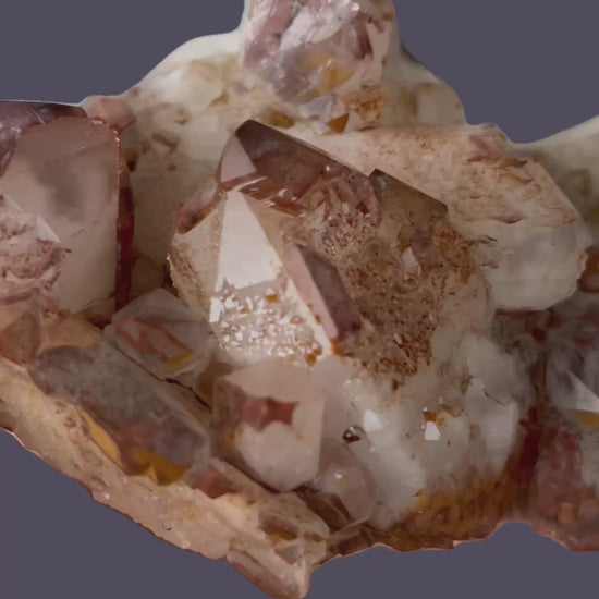 Mehrere Kristalle weisen markante Hämatit-Phantome auf, die verschiedene Wachstumsphasen dokumentieren und dem Stück eine beeindruckende visuelle Tiefe sowie wissenschaftlichen Wert verleihen. Besonders hervorzuheben sind die seltenen inversen Zepterformationen, die dieses Stück zu einem absoluten Blickfang und einem wahren Sammlerstück machen. Die Gesamtästhetik, die Kristallklarheit und die Provenienz positionieren dieses Stück eindeutig unter den hochwertigen Sammlerstücken mit bleibendem Wert.