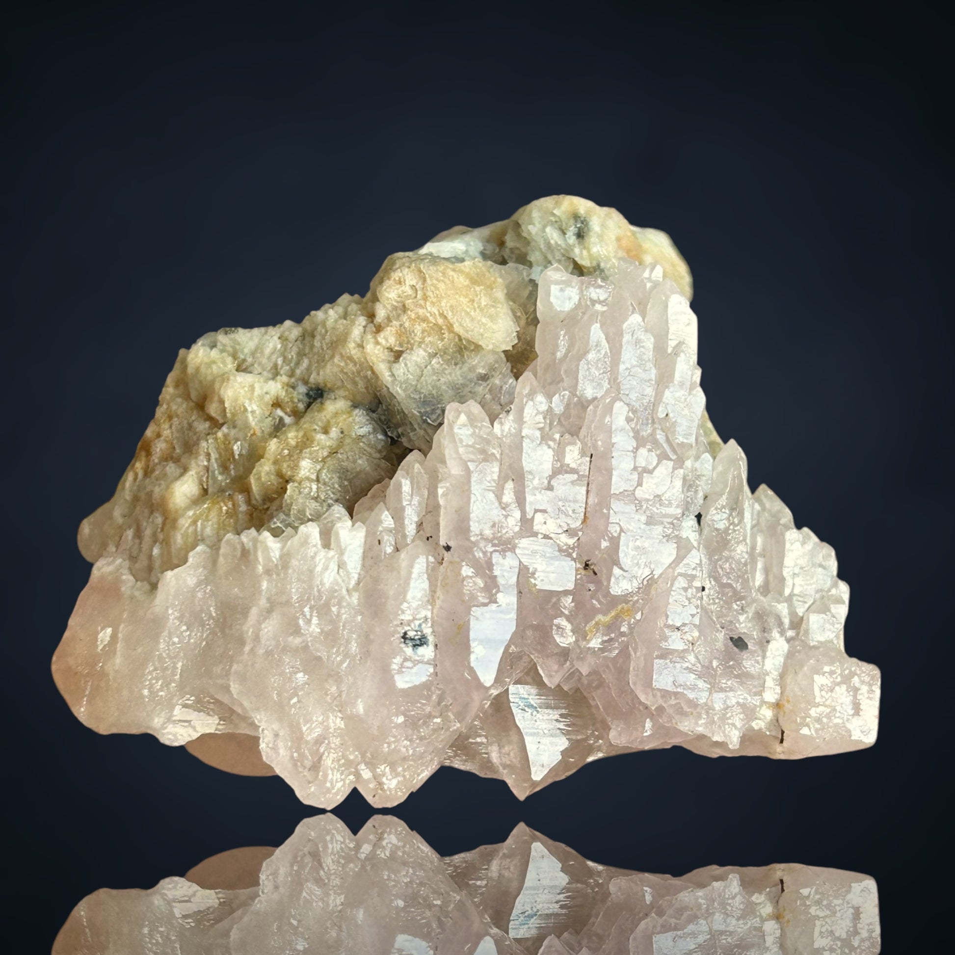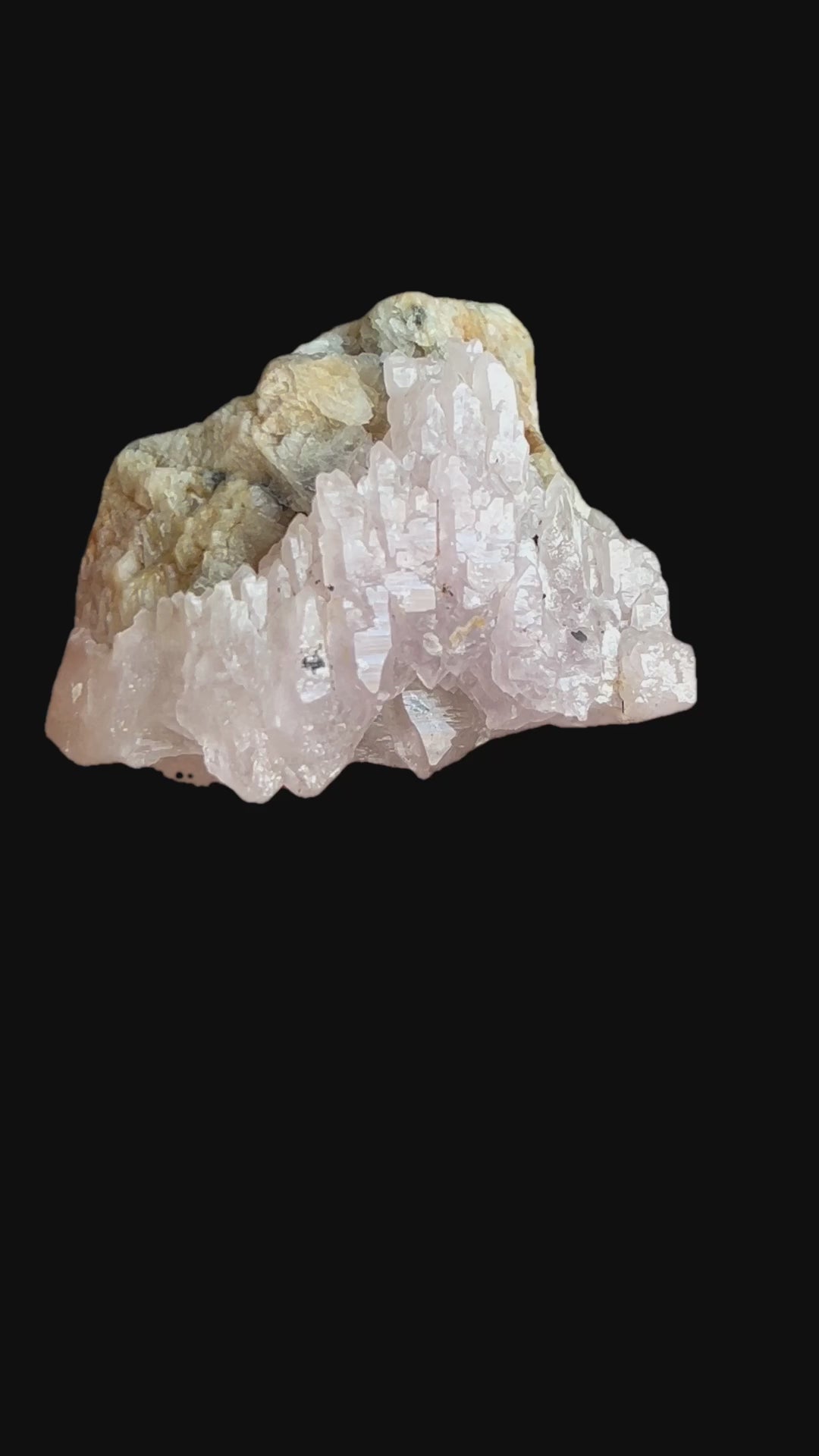 🇩🇪 Satt rosafarbene Quarzkristalle, großteils als Doppelender ausgebildet, auf Feldspat.