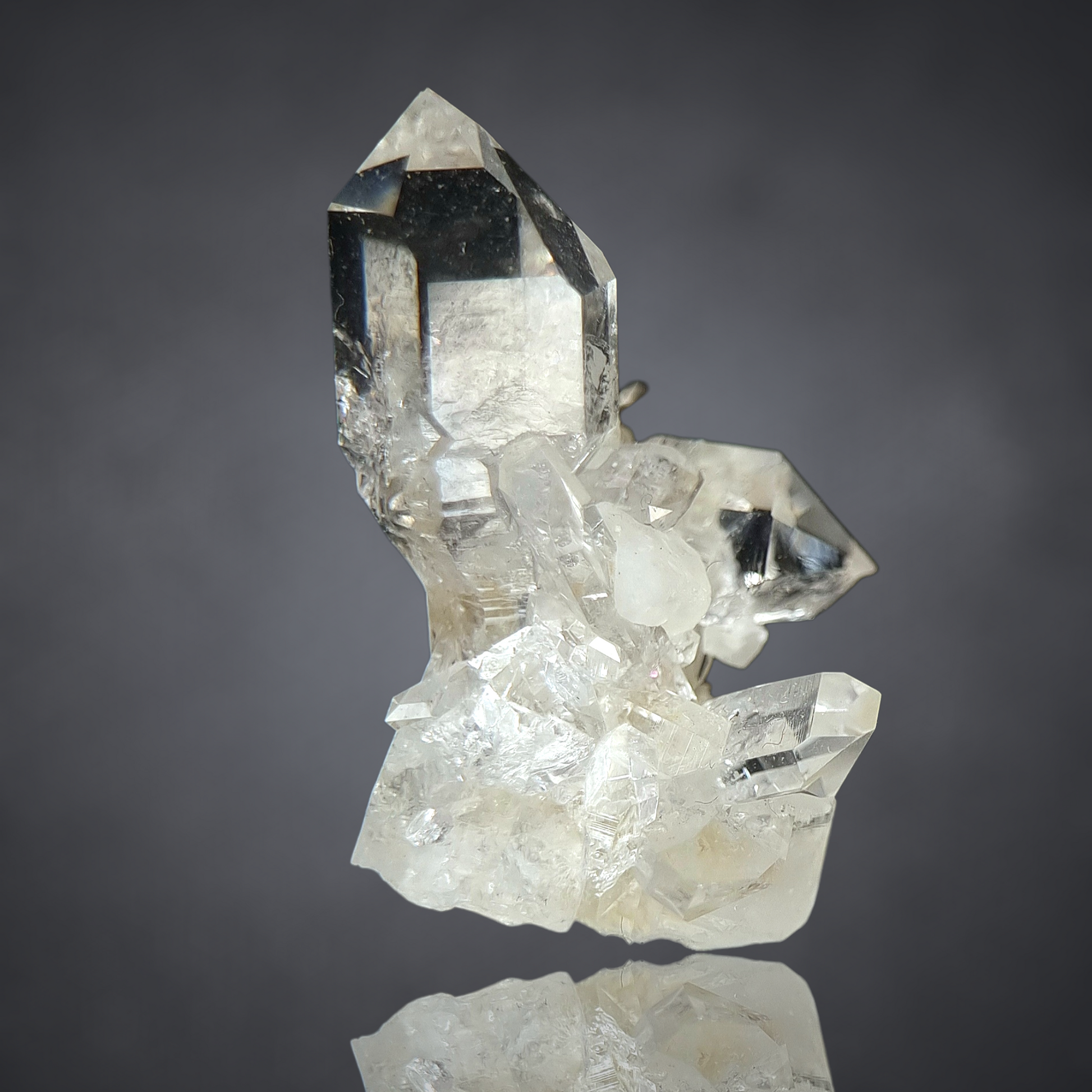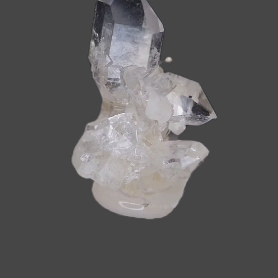 Brillanter, transparenter, hochglänzender Quarzkristallcluster, bekannt als Schaumburger Diamant, das deutsche Analogon zum Herkimer-Quarz.