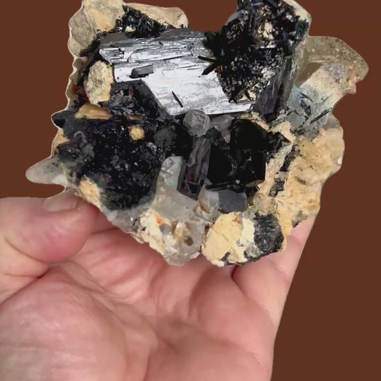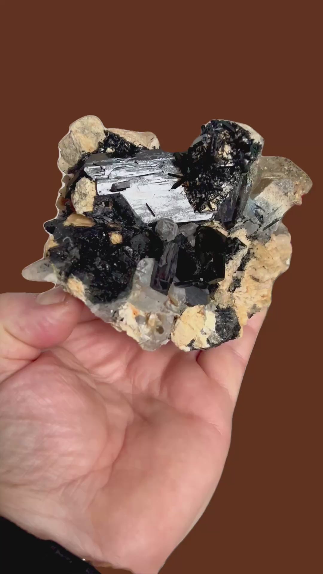 Ein handgroßes Vitrinenstück mit mehreren Rauchquarzkristallen und hochglänzenden schwarzen Schörl-Turmalinen von bis zu 7 cm Länge auf Orthoklas.