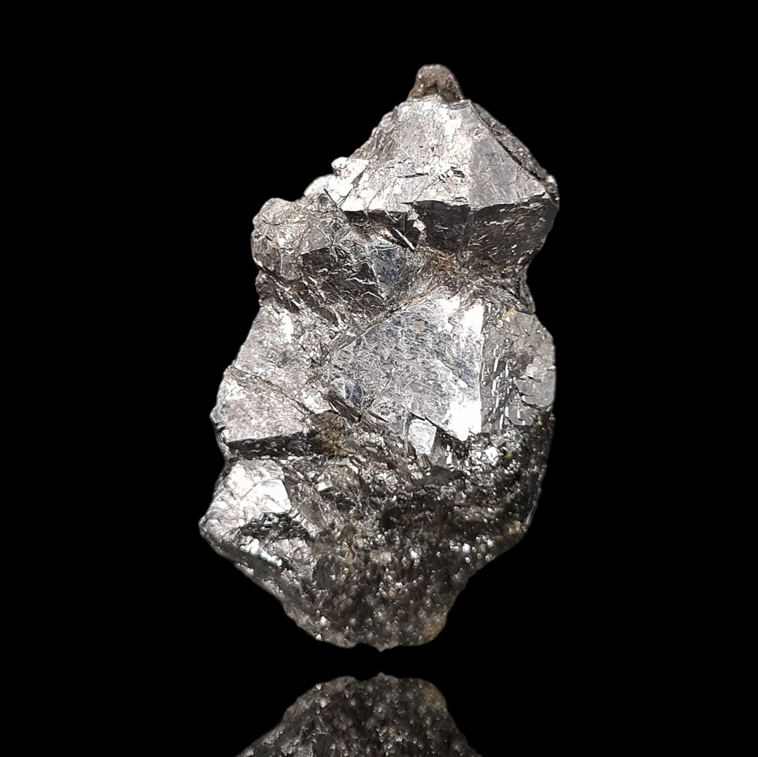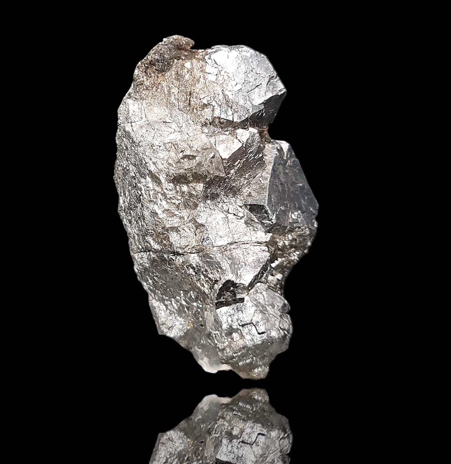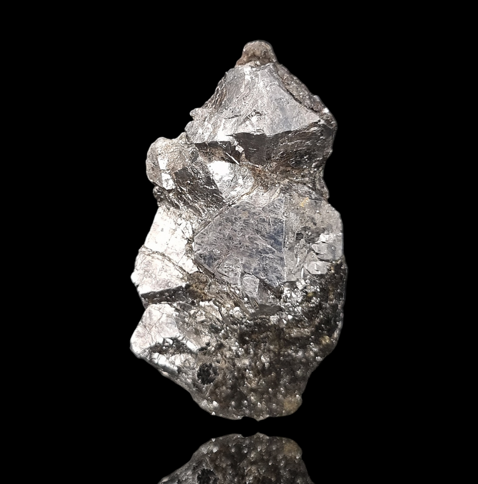 🇺🇲Terrific group of sharp, silvery-bright, octahedral crystals with structured faces and chrome-like lustre from the well-known locality of Bou Azzer in Morocco. Some minor golden metallic chalcopyrite is associated, too.