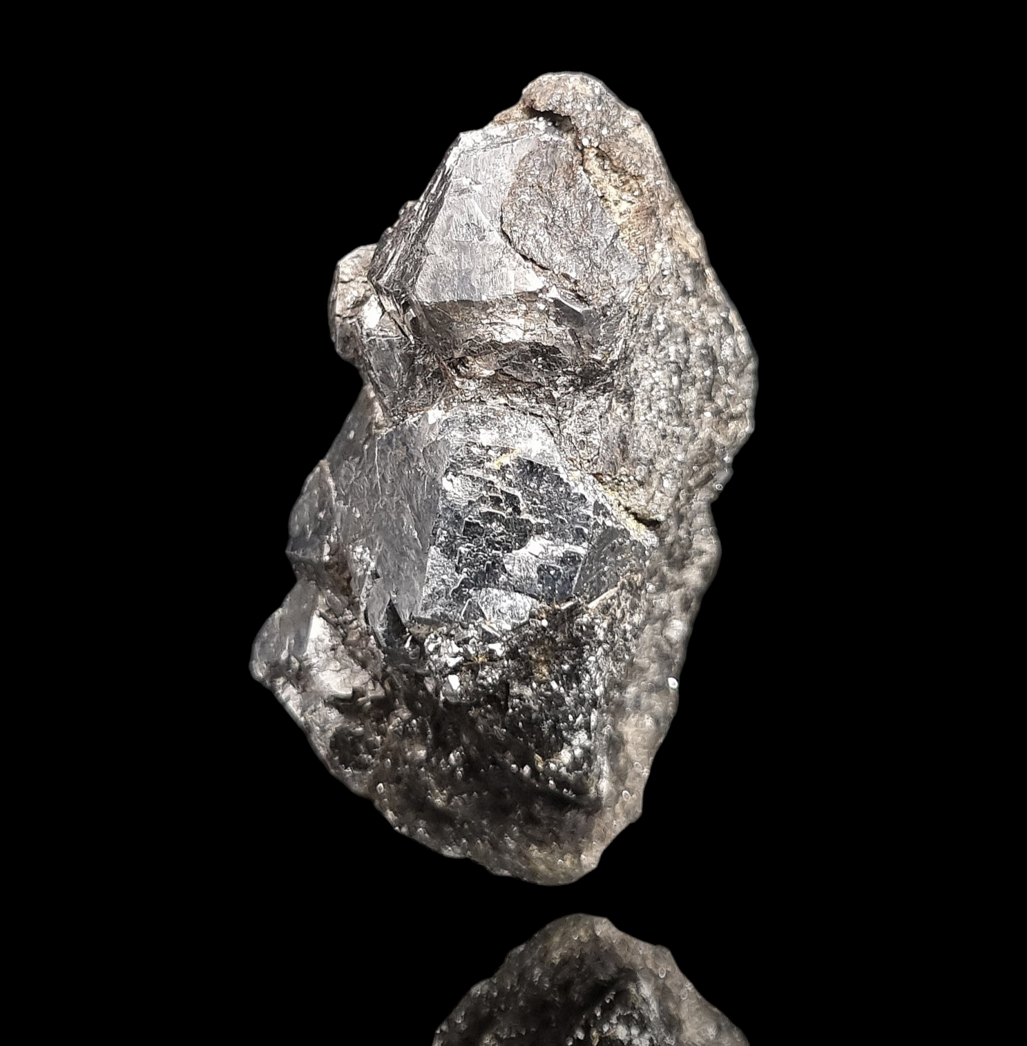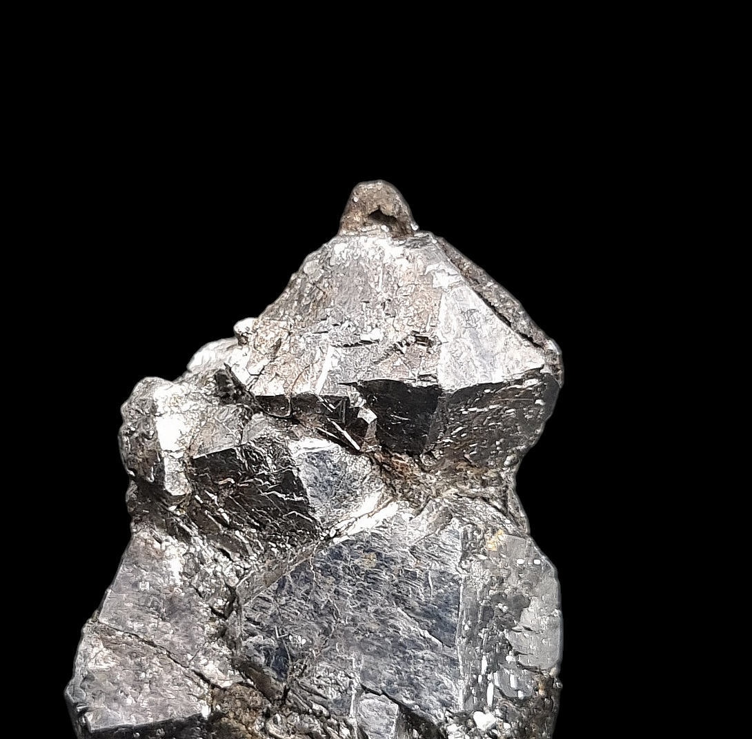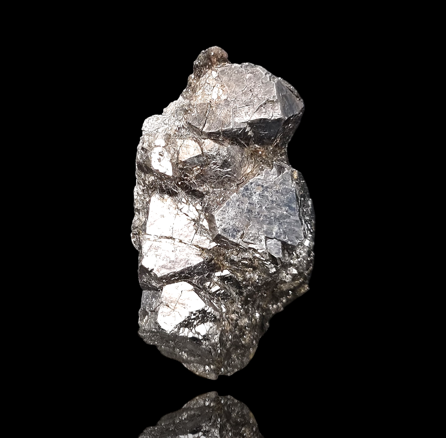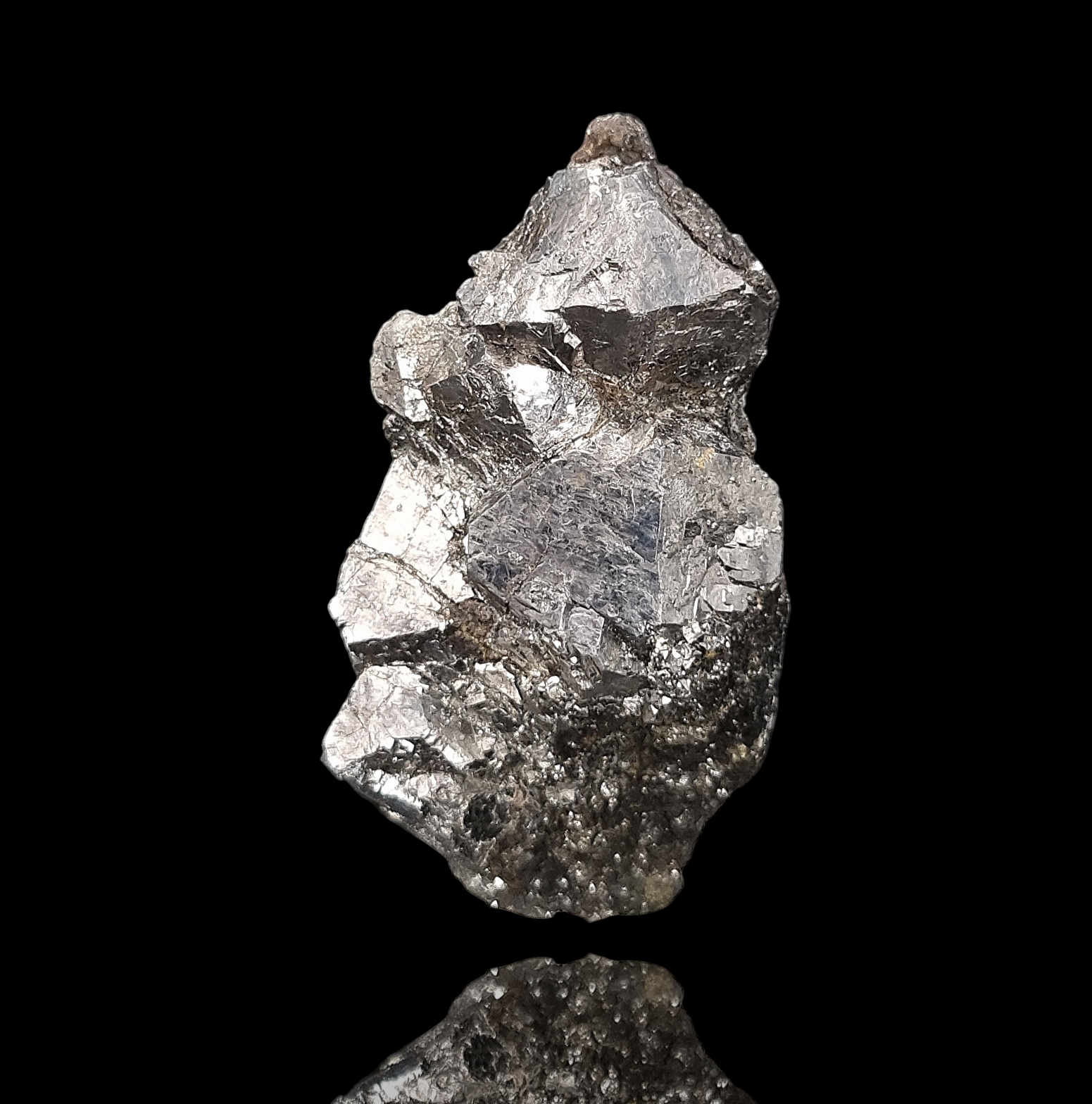 🇺🇲Terrific group of sharp, silvery-bright, octahedral crystals with structured faces and chrome-like lustre from the well-known locality of Bou Azzer in Morocco. Some minor golden metallic chalcopyrite is associated, too.